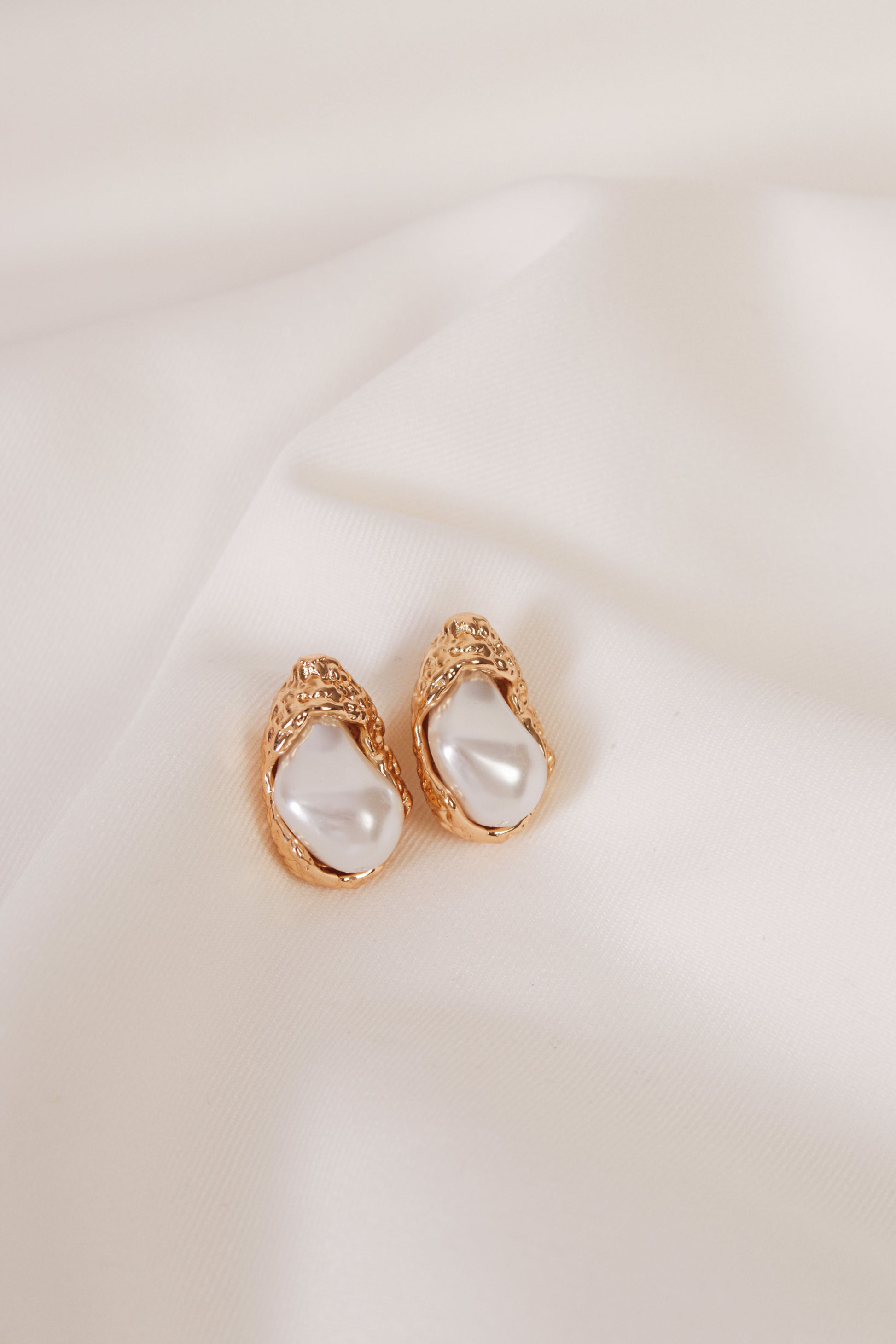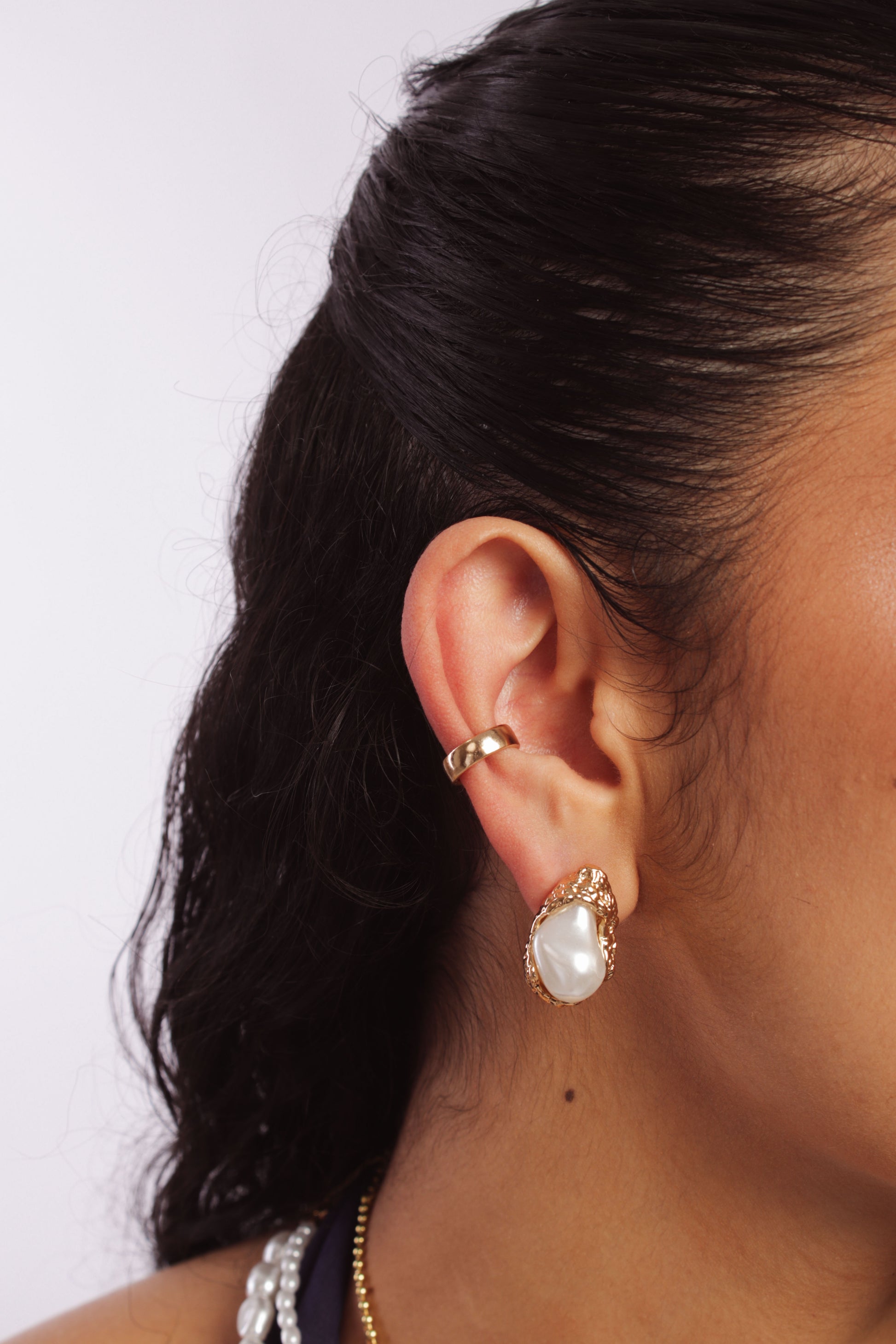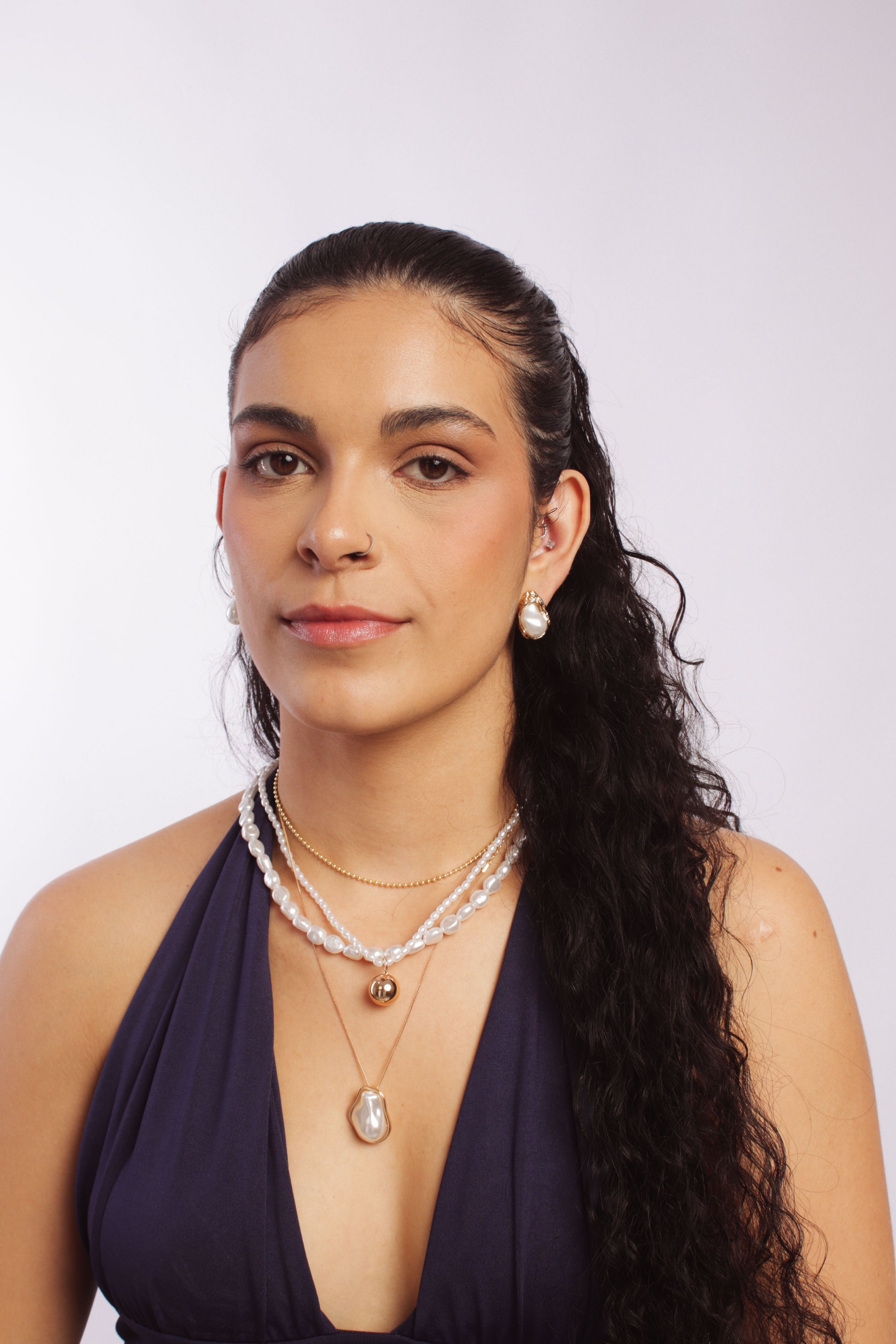 O Brinco Aurora possui design assimétrico com base orgânica dourada e aplicação de pérola resinada, criando um contraste delicado e sofisticado. Sua textura irregular confere um charme artesanal à peça, ideal para composições elegantes e atemporais.
