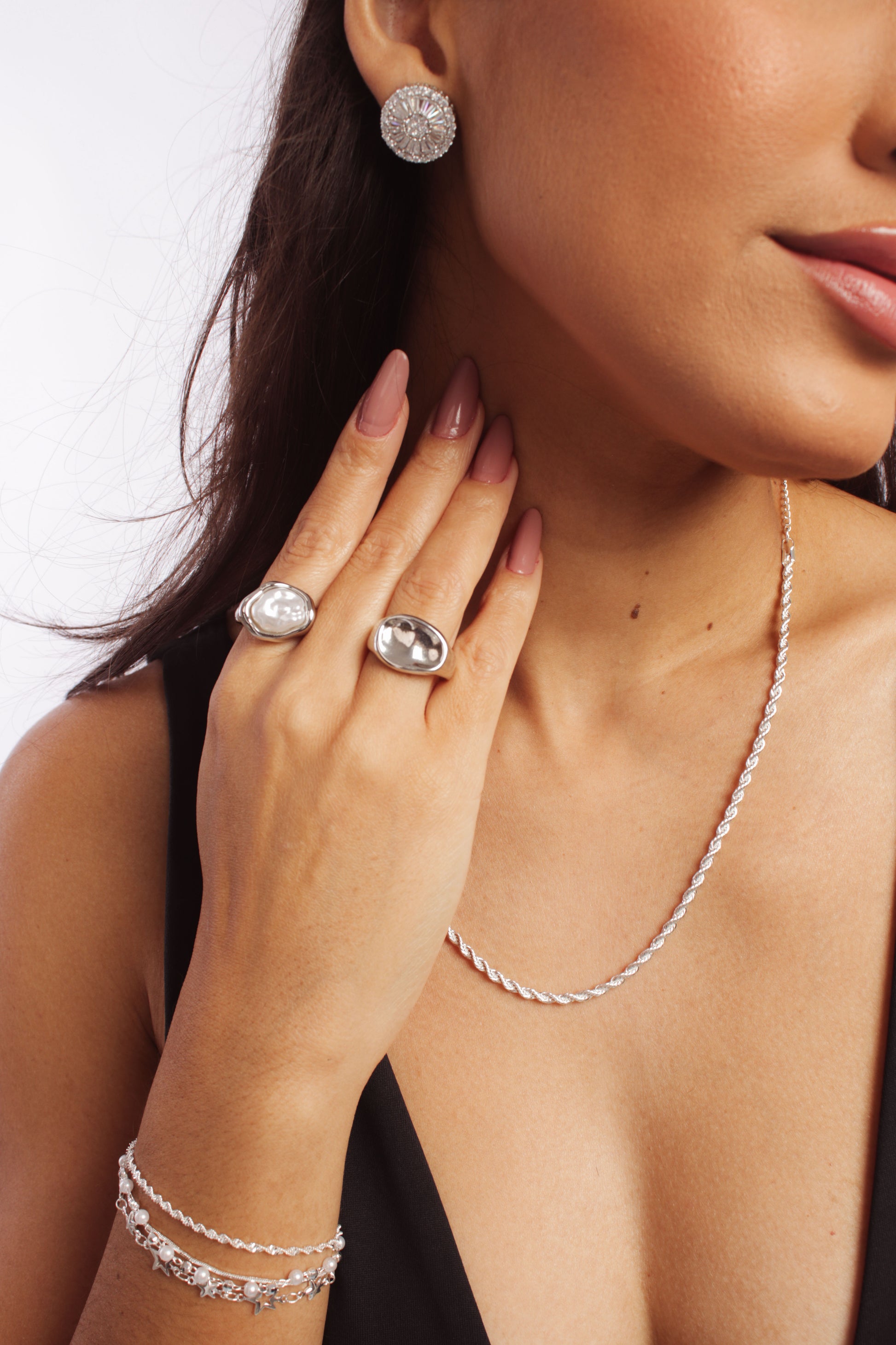 Esta peça é uma bijuteria, com banho metálico prateado e/ou dourado e acabamento com verniz protetor, proporcionando brilho prolongado e aparência semelhante à prata.