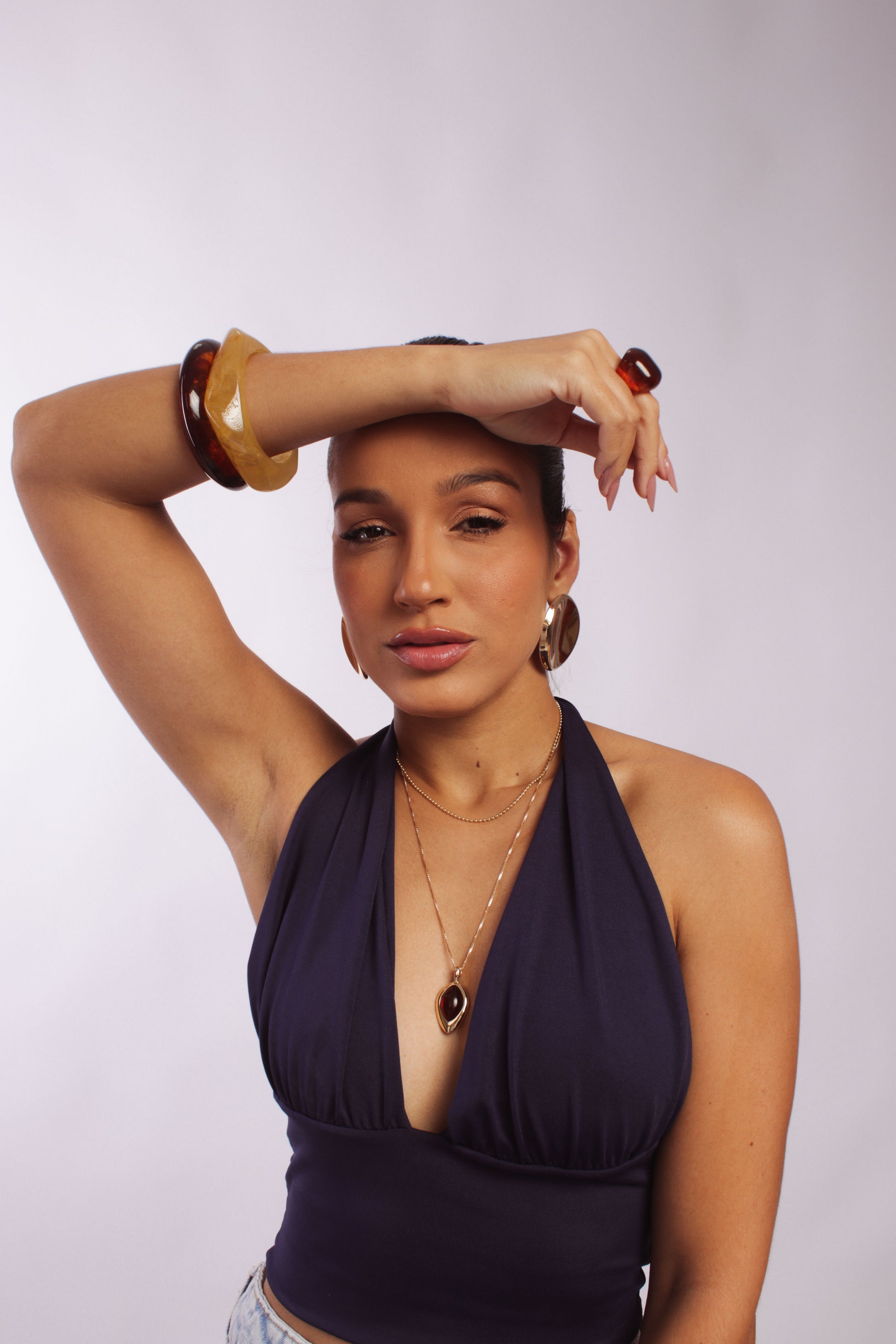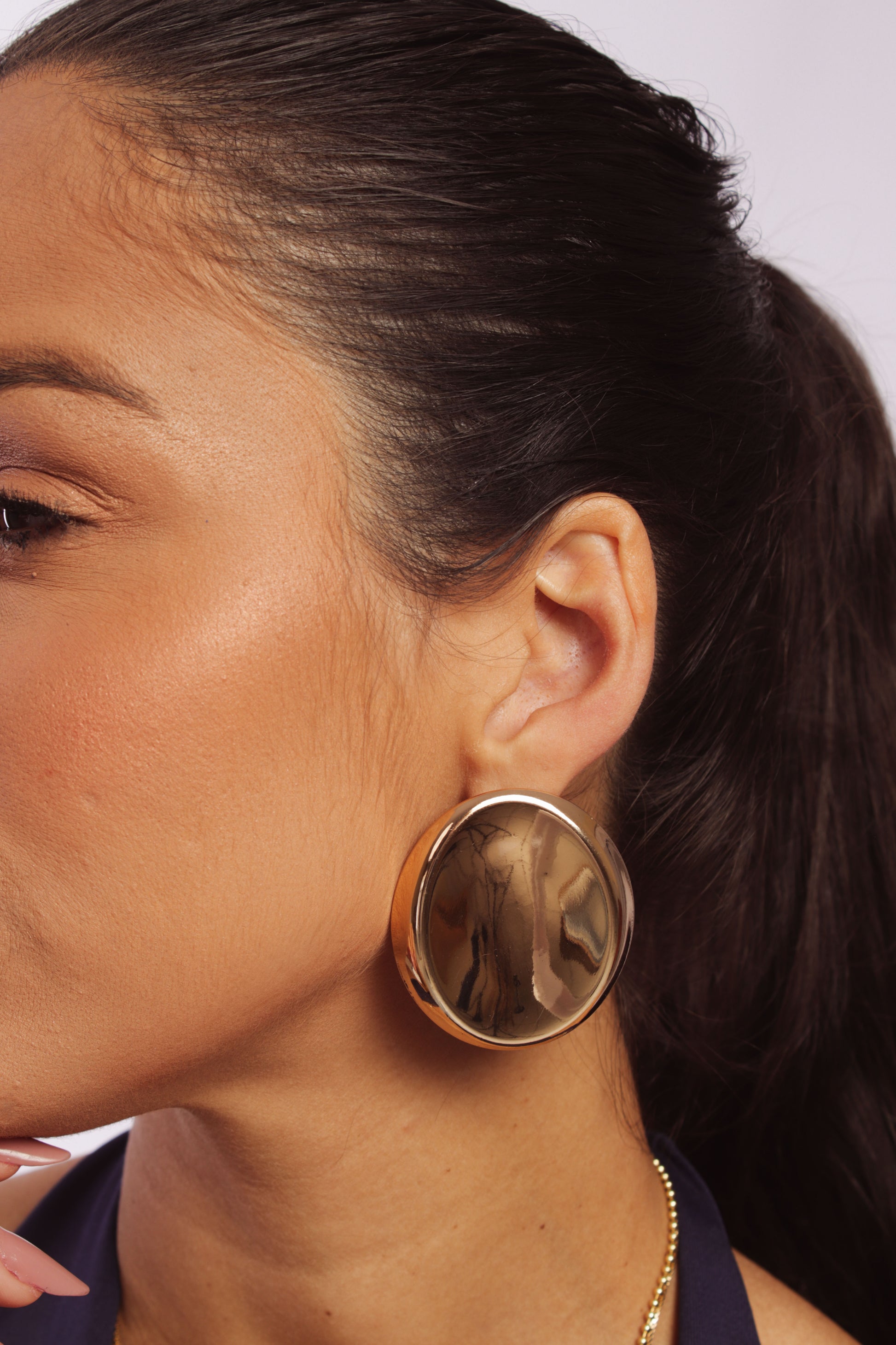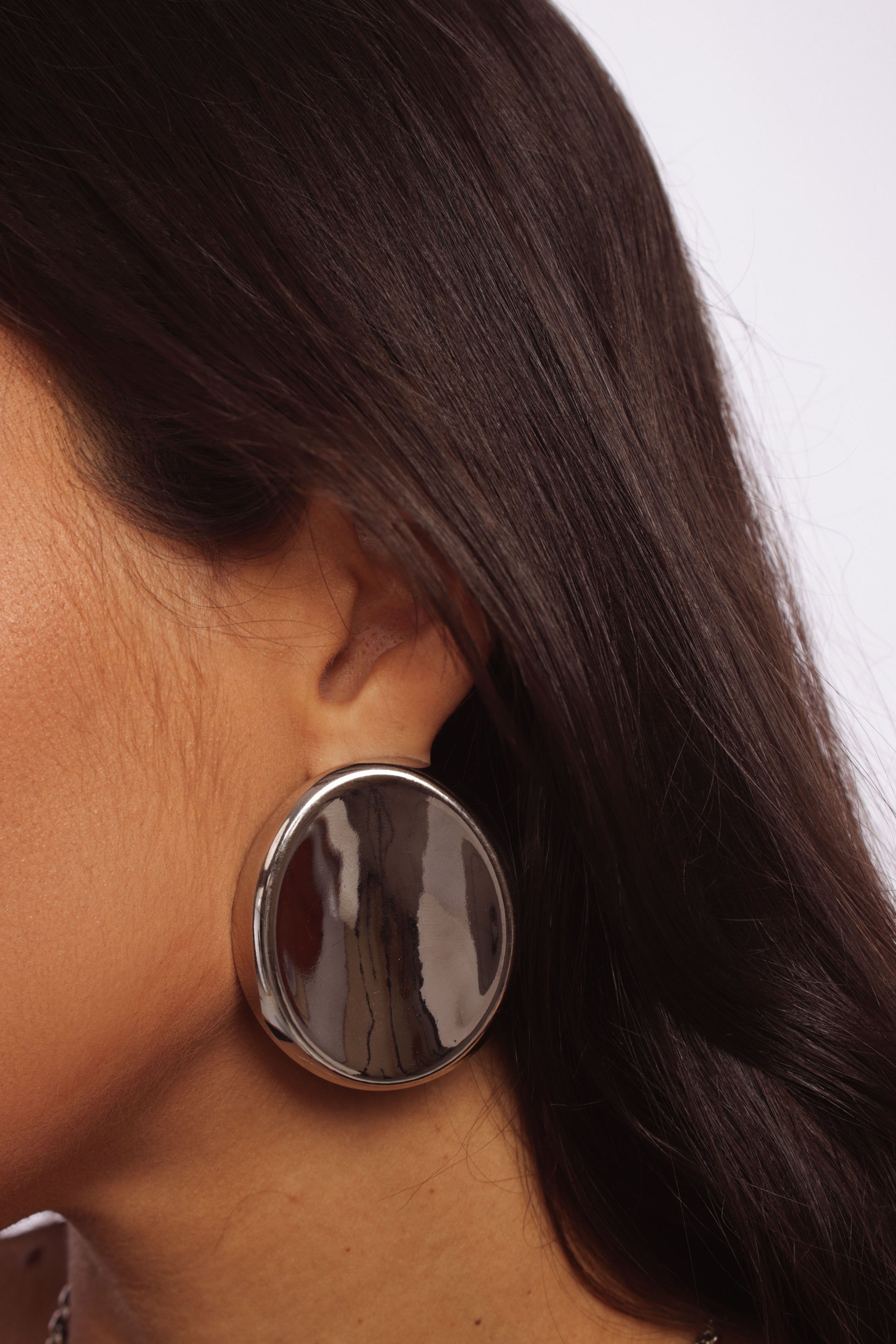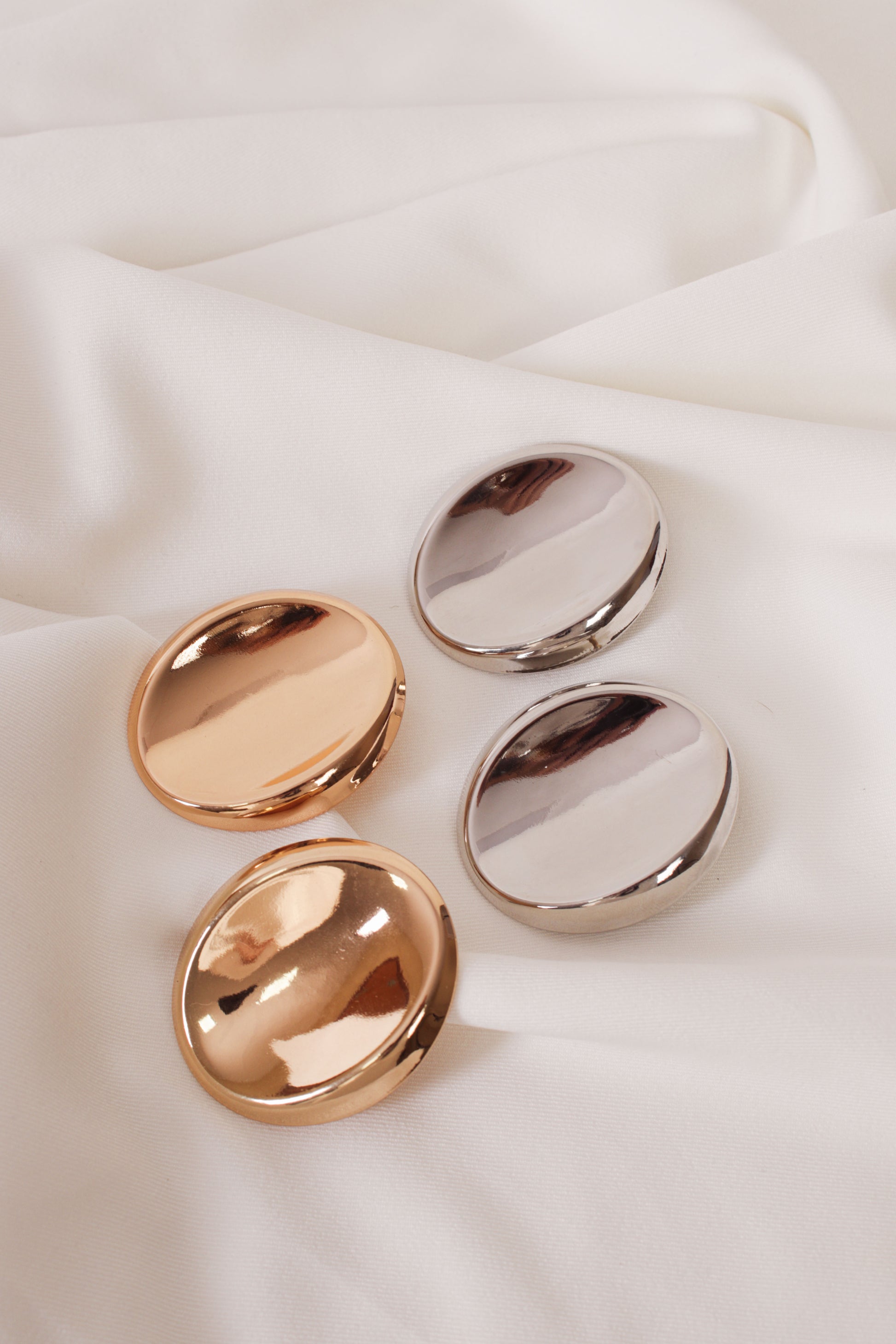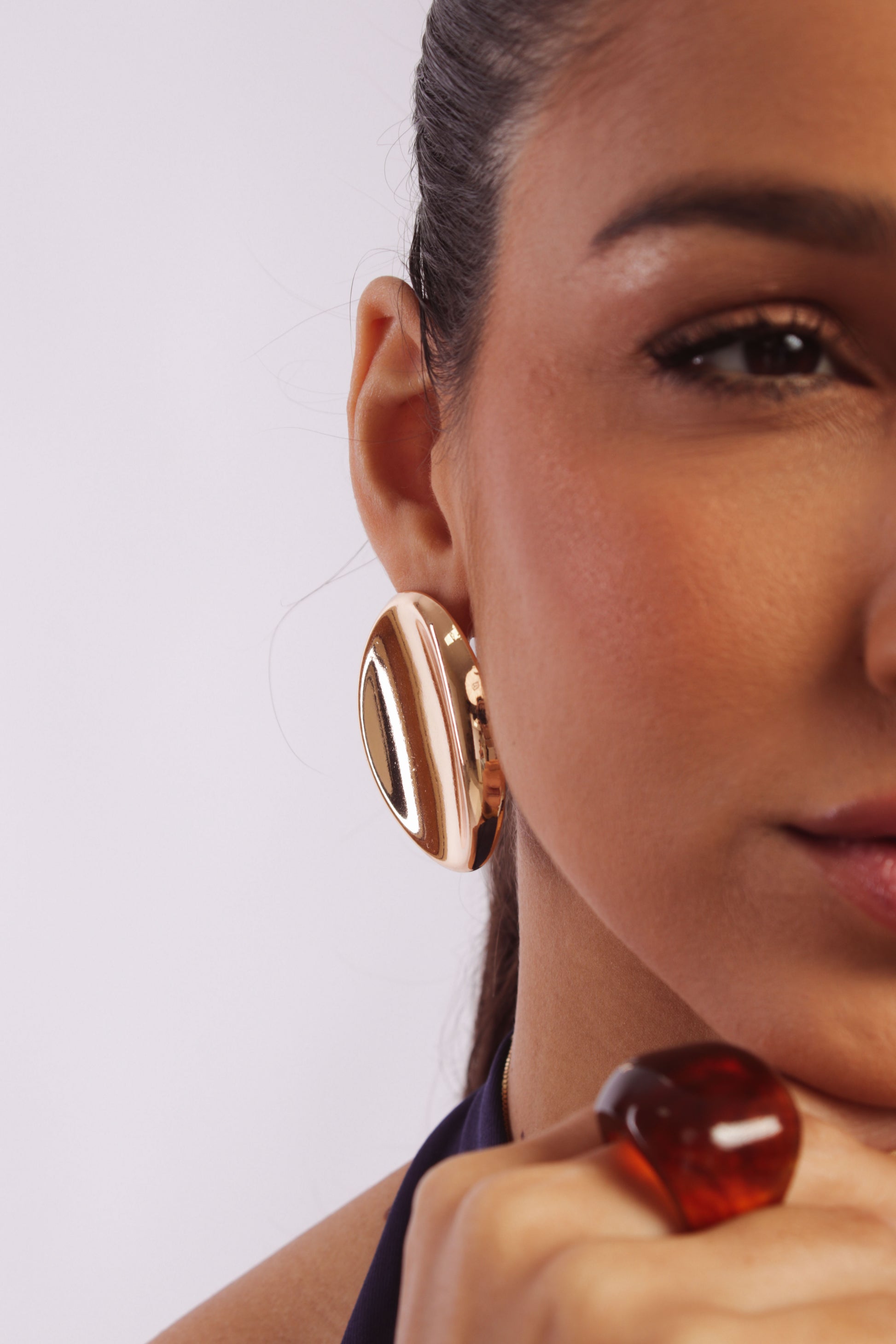 O Brinco Refúgio possui design circular com superfície espelhada e borda levemente arredondada. Seu acabamento metálico prateado e/ou dourado confere um visual moderno e impactante, perfeito para composições elegantes ou produções mais ousadas.