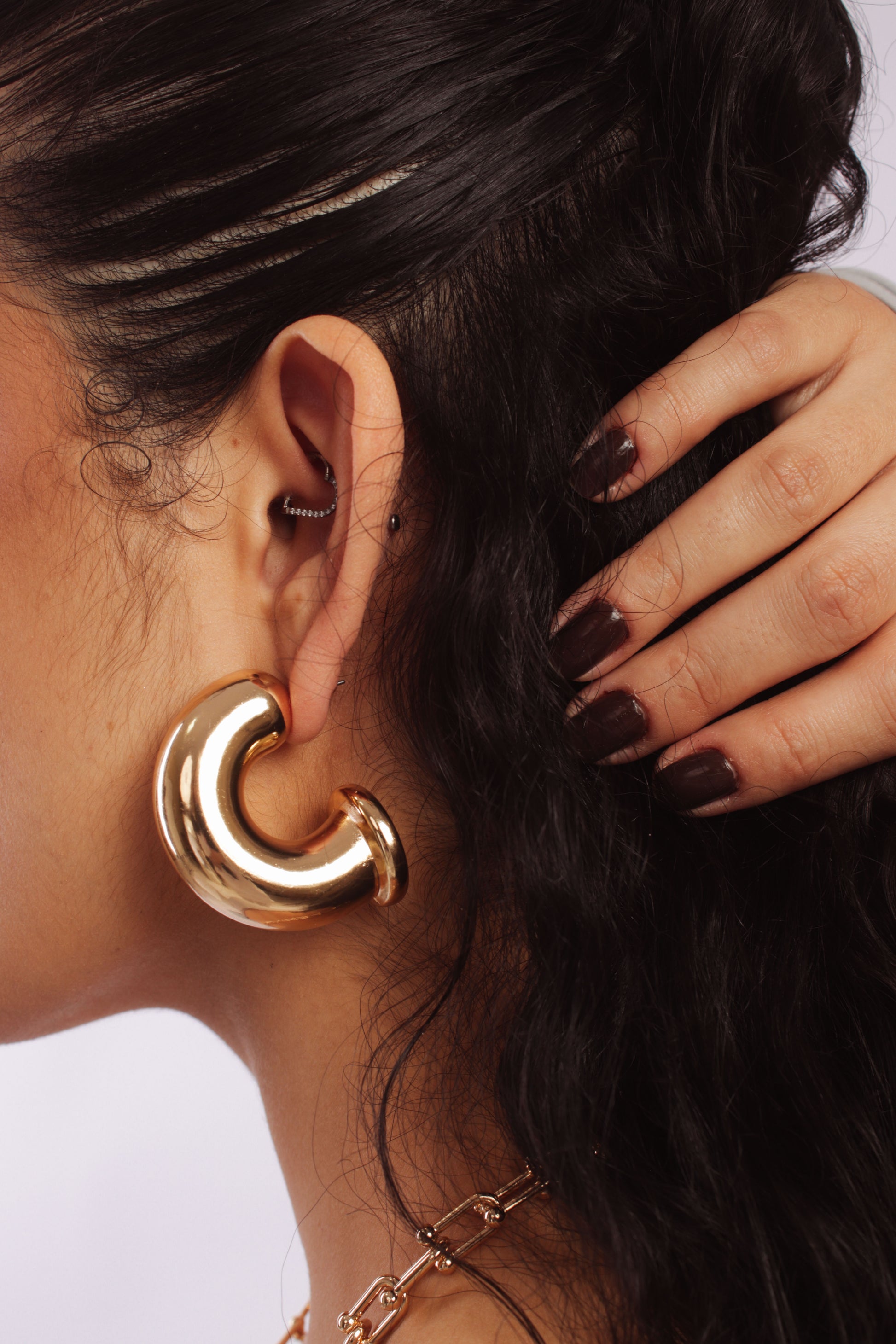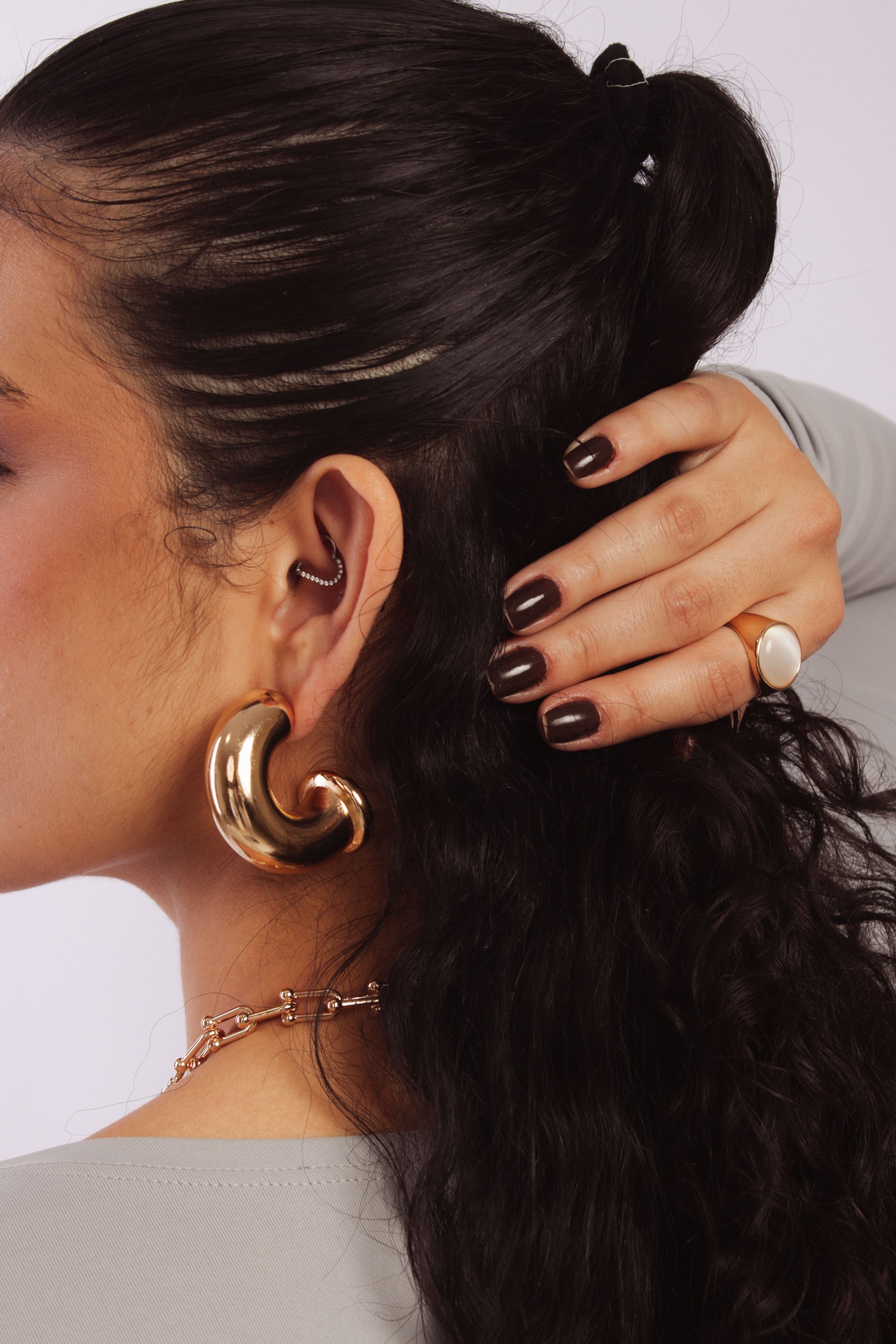 O banho metálico em tom de ródio confere um brilho sofisticado e um visual imponente, perfeito para compor produções minimalistas ou maximalistas.
