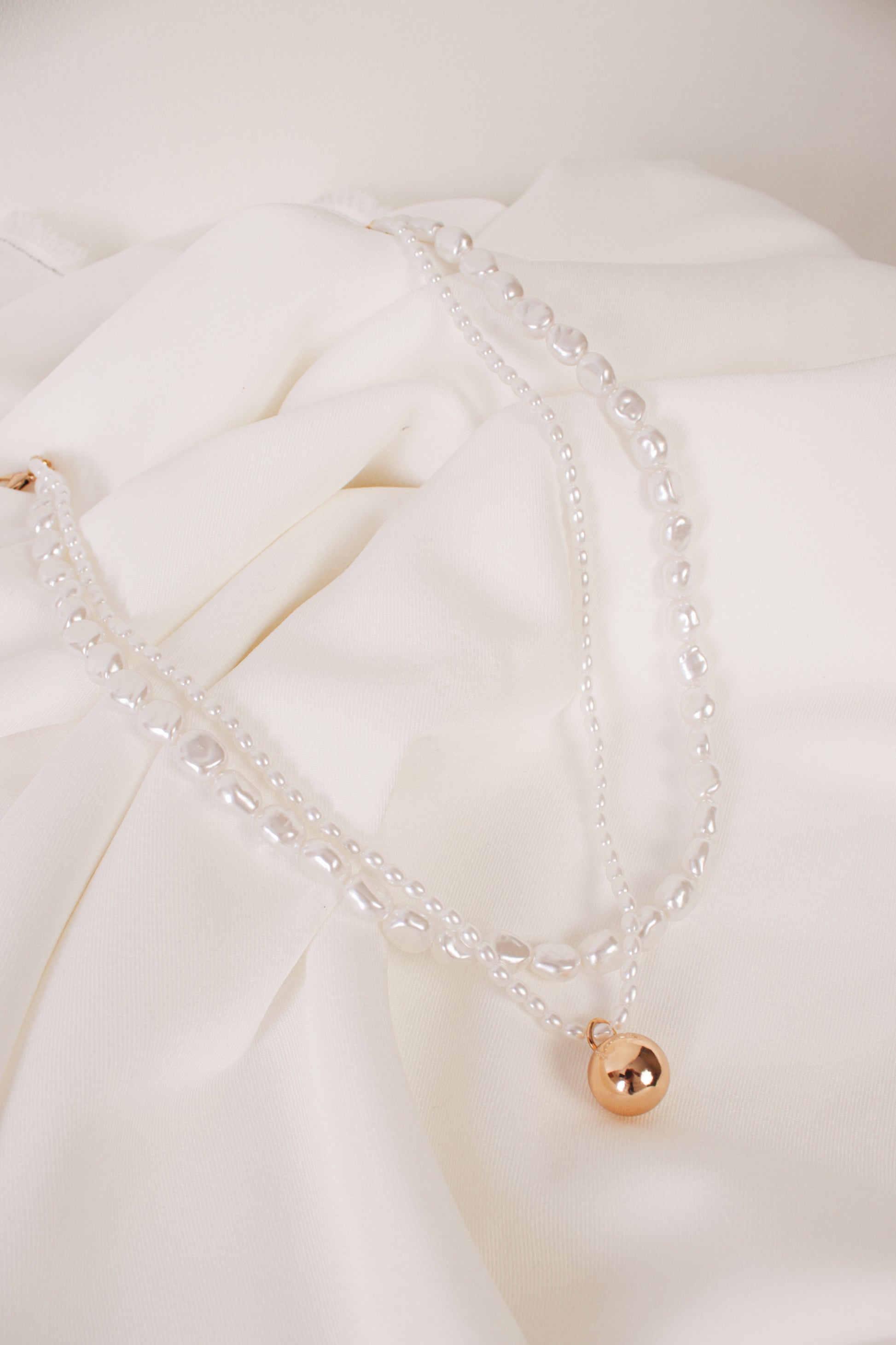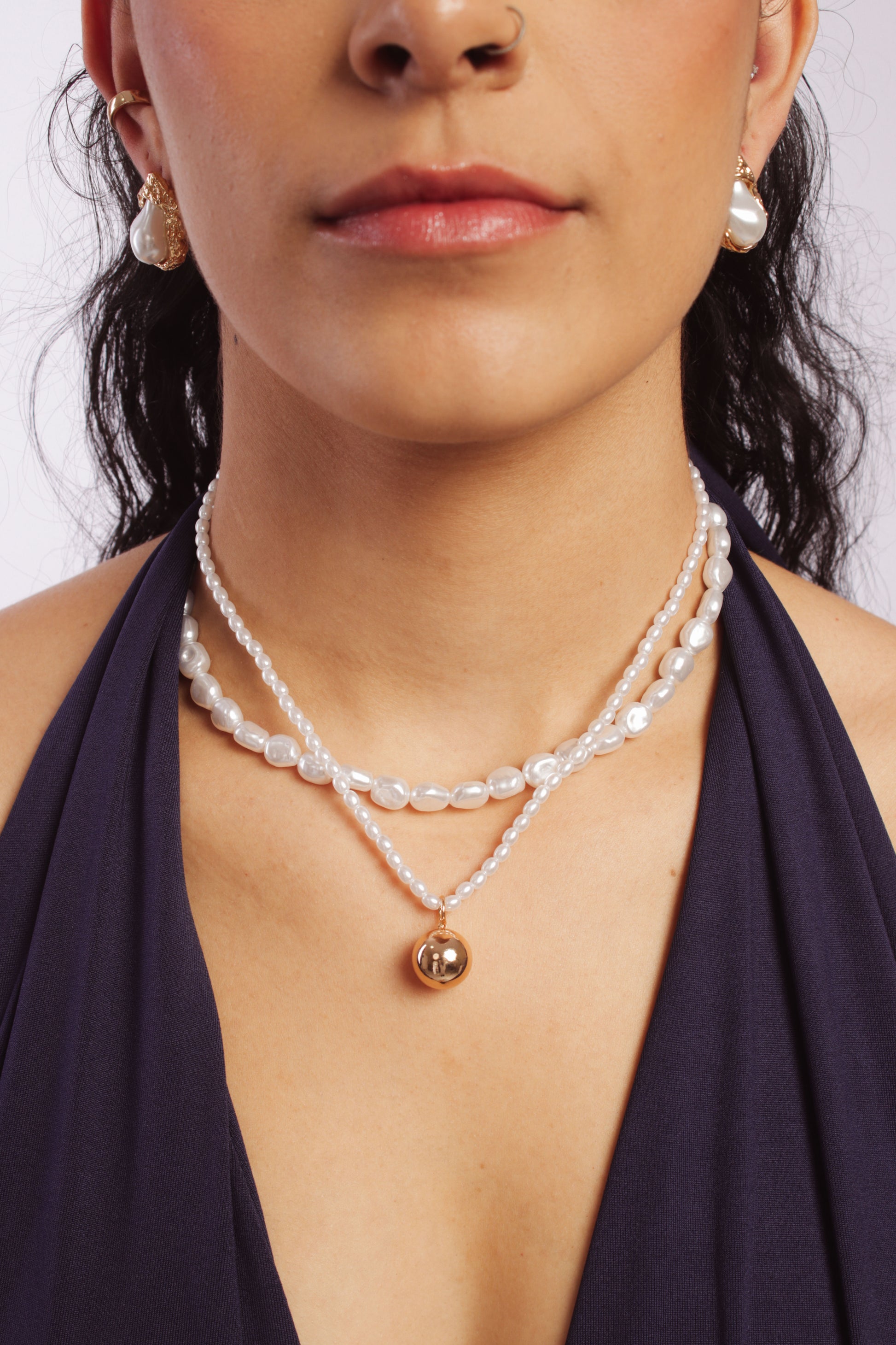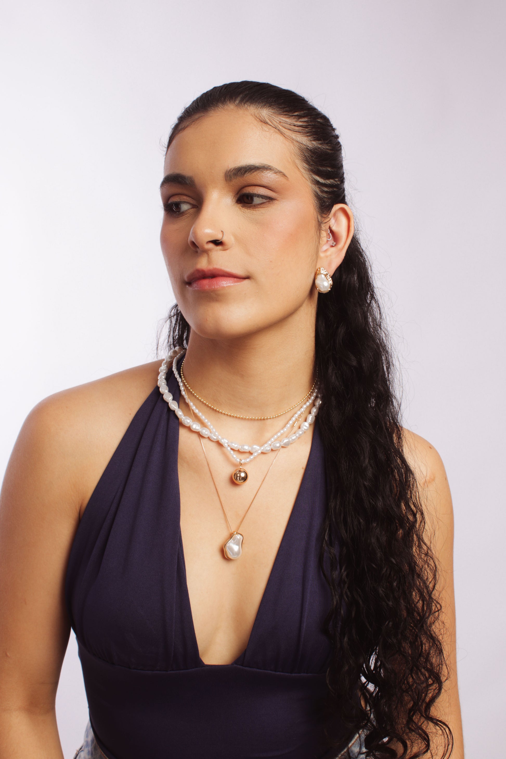 O Colar Dama é composto por duas voltas com pérolas sintéticas em formatos orgânicos e acabamento perolado, finalizado com um pingente esfera dourado de brilho espelhado. A composição clássica das pérolas encontra o toque moderno do banho dourado, resultando em uma peça elegante e atemporal.