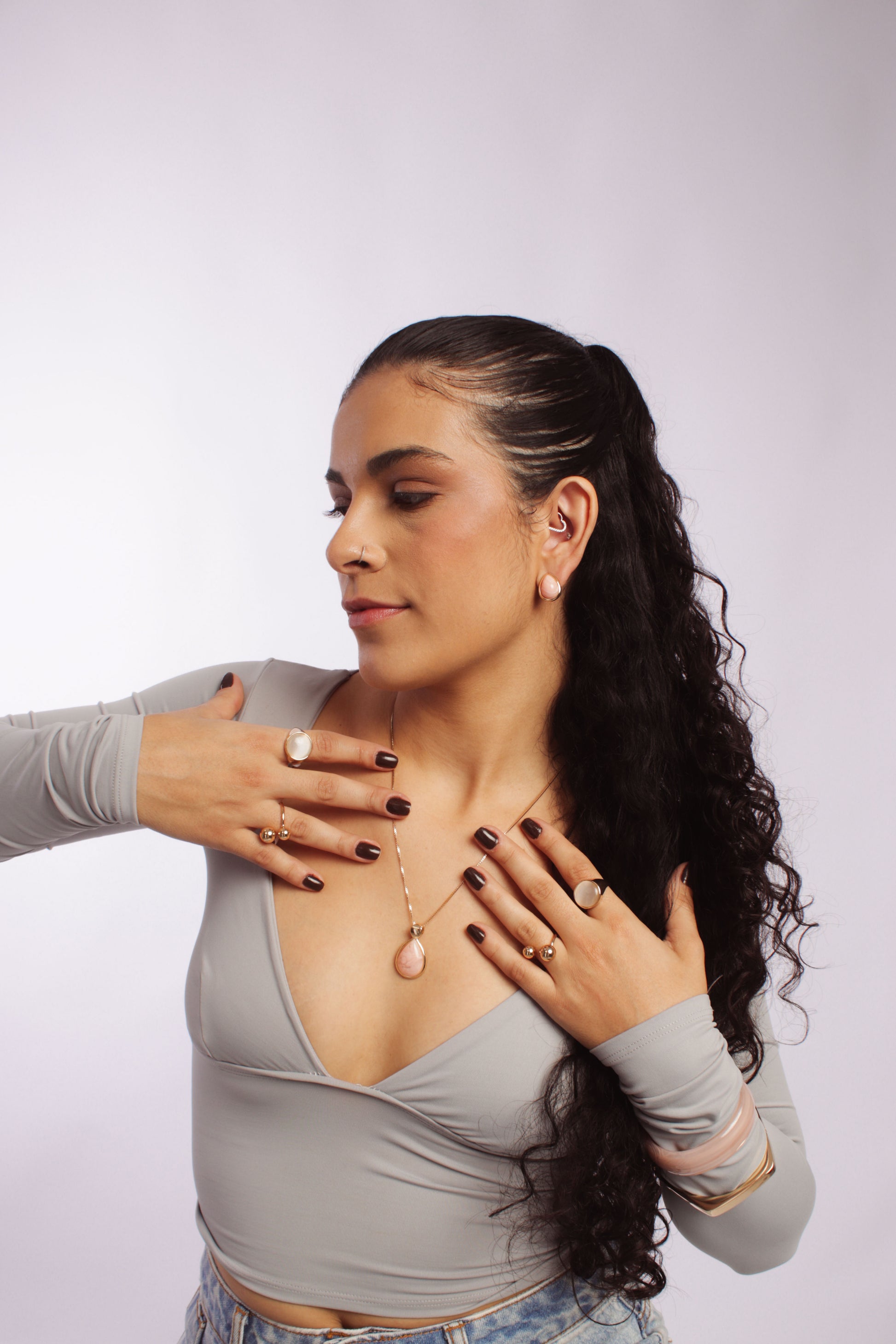 Delicado e sofisticado, o Colar Gota Rosa Dourado é a escolha ideal para quem busca um visual leve e romântico. Com pedra sintética em tom rosado, lapidada em formato de gota, ele transmite suavidade e elegância. A estrutura com banho dourado realça ainda mais o brilho da peça e cria um contraste harmônico com a pedra.