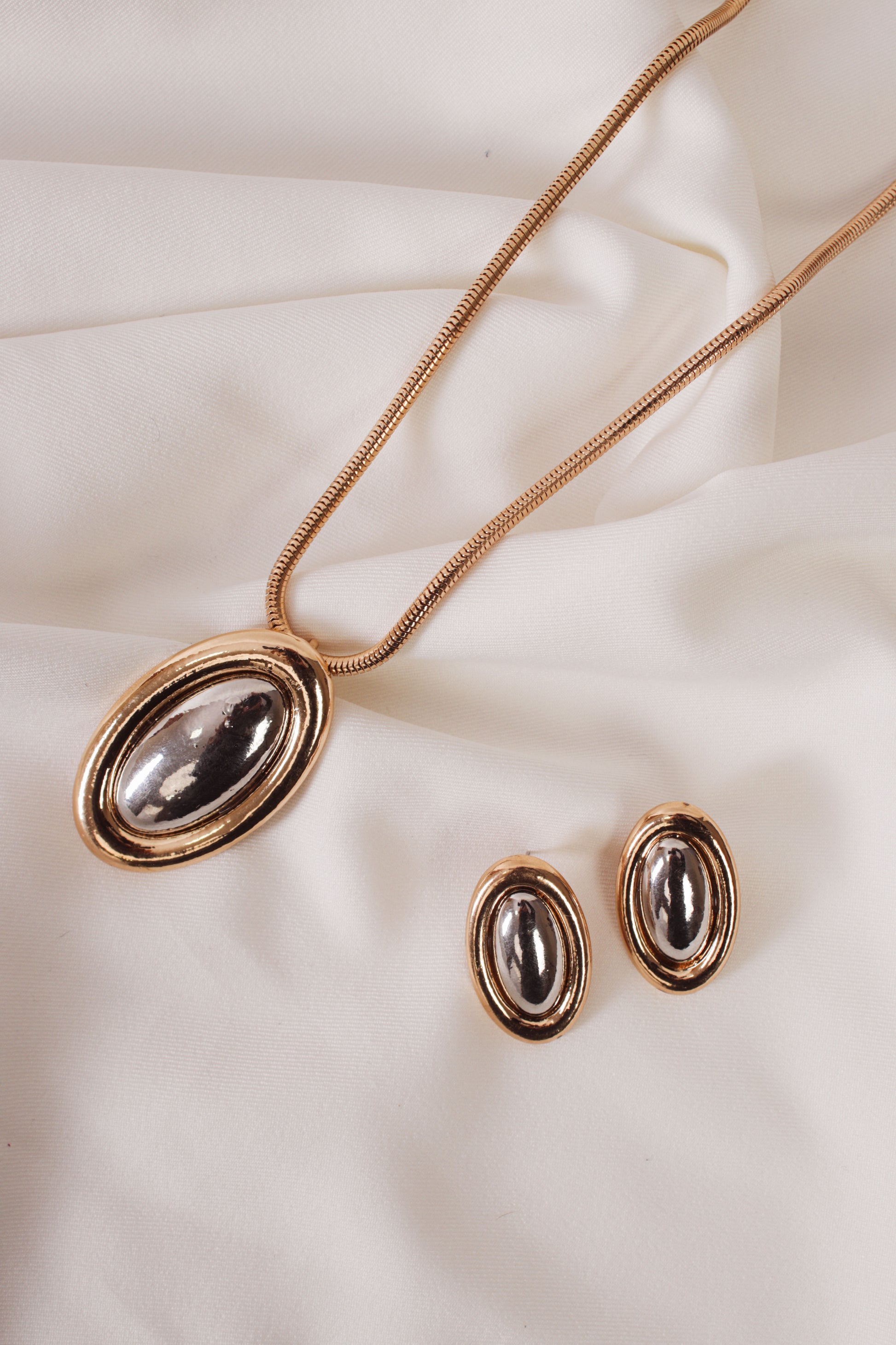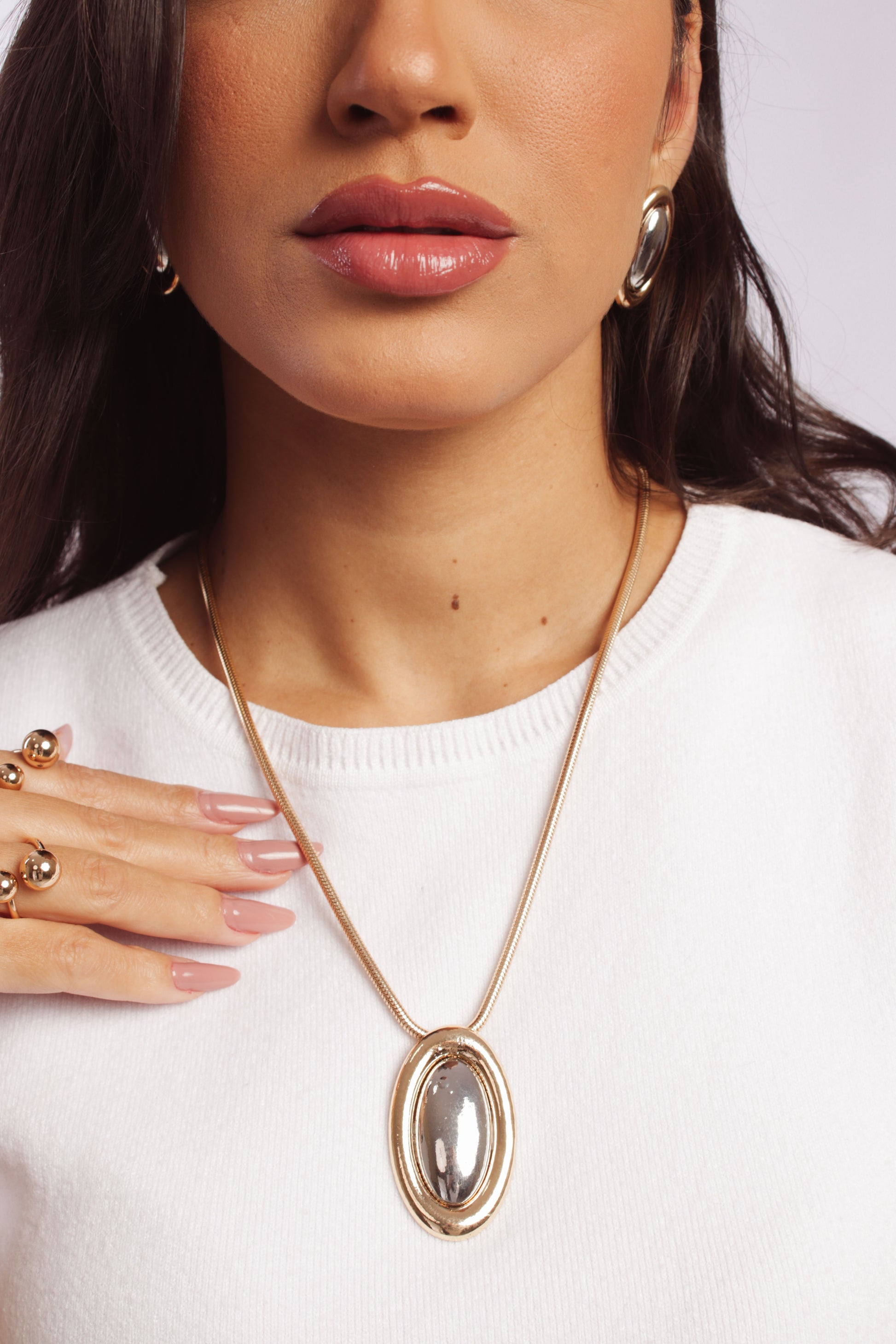 O Colar Impacto possui pingente oval com acabamento espelhado no centro e moldura lisa dourada. É uma peça marcante que combina elegância com presença impactante.
